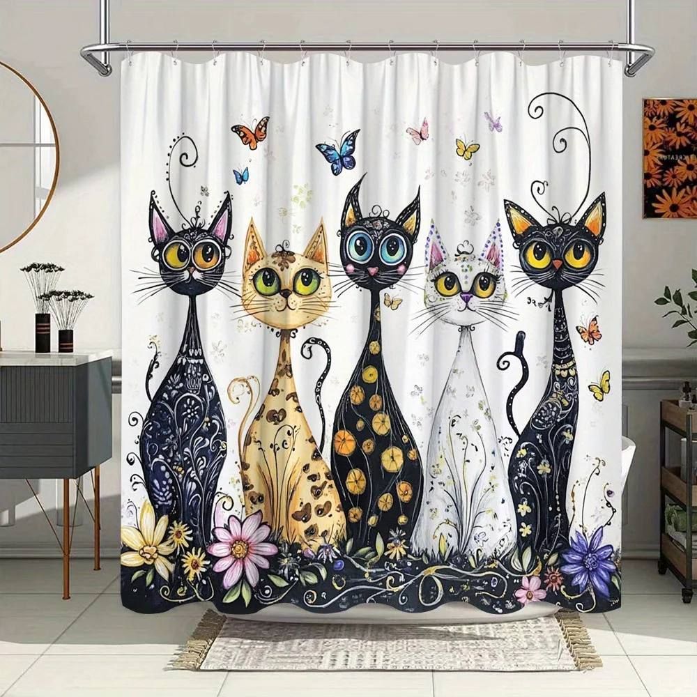 Whimsical Cat Shower Curtain - Fun Hand-Drawn Design with Floral & Butterfly Accents, Water-Resistant Polyester Fabric